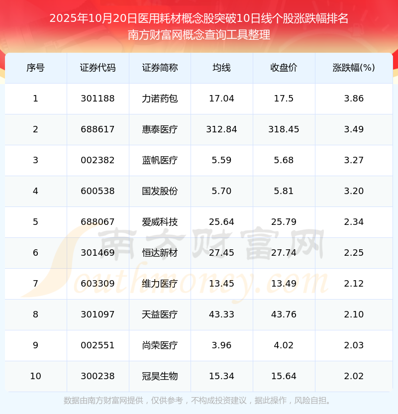 2025年10月20日醫(yī)用耗材概念股突破10日線個股漲跌幅排名