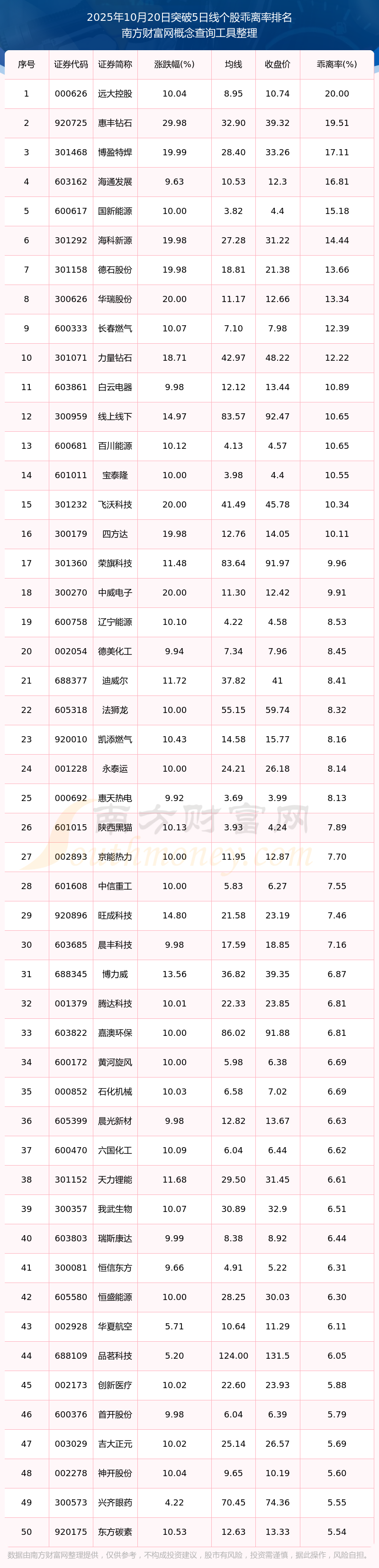 根據(jù)南方財富網(wǎng)概念查詢工具數(shù)據(jù)統(tǒng)計,截止2025年10月20日收盤,共有1297只個股收盤價向上突破了5日線,其中乖離率較大的個股有遠大控股、惠豐鉆石、博盈特焊、海通發(fā)展、國新能源等,乖離率分別為20.00%、19.51%、17.11%、16.81%、15.18%。