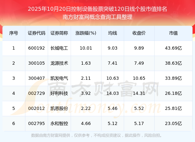 2025年10月20日控制設(shè)備股票突破120日線個(gè)股市值排名