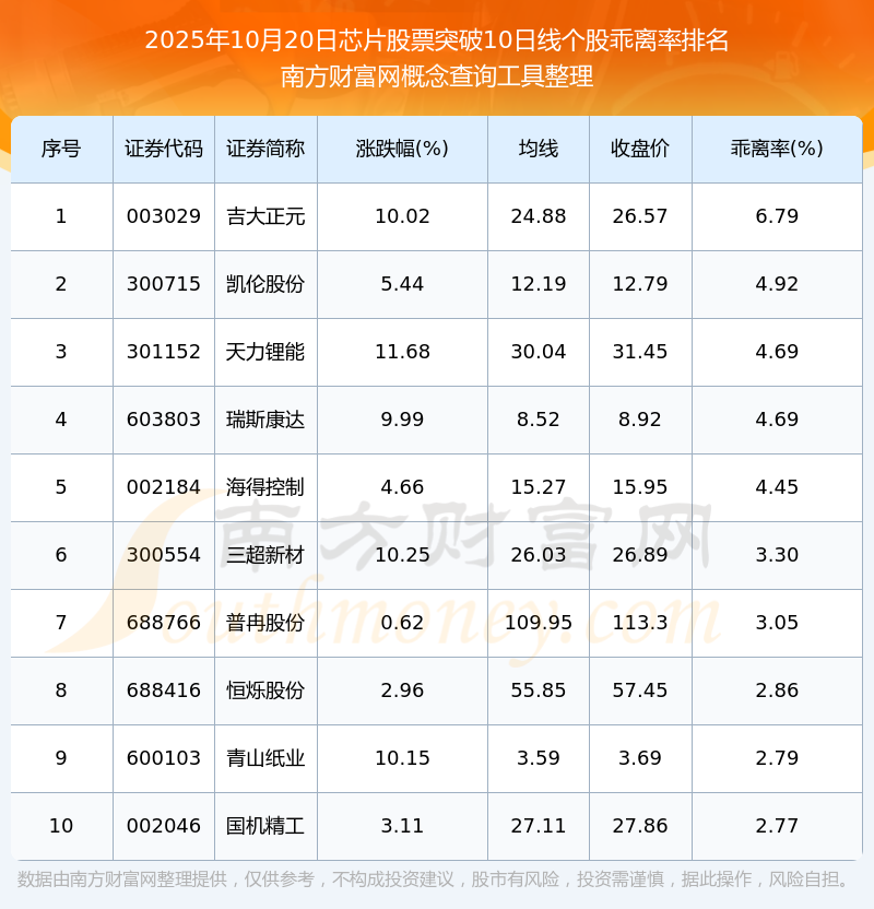 2025年10月20日芯片股票突破10日線個股乖離率排名