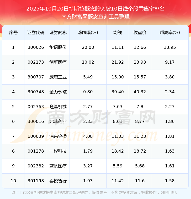 2025年10月20日特斯拉概念股突破10日線個(gè)股乖離率排名