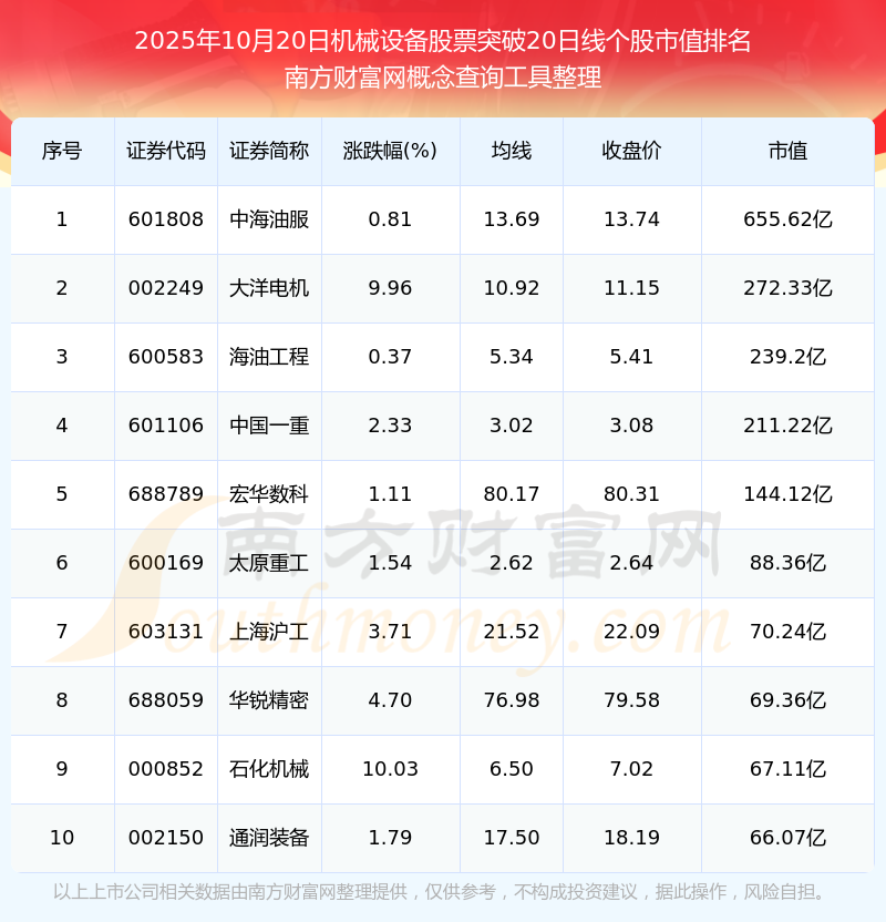 2025年10月20日機(jī)械設(shè)備股票突破20日線個(gè)股市值排名