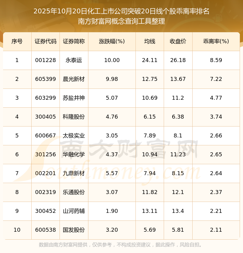 根據(jù)南方財富網(wǎng)概念查詢工具數(shù)據(jù)統(tǒng)計,截止2025年10月20日收盤,化工上市公司共有61只個股收盤價向上突破了20日線。其中乖離率較大的個股有永泰運、晨光新材、蘇鹽井神等,乖離率分別為8.59%、7.22%、4.77%。