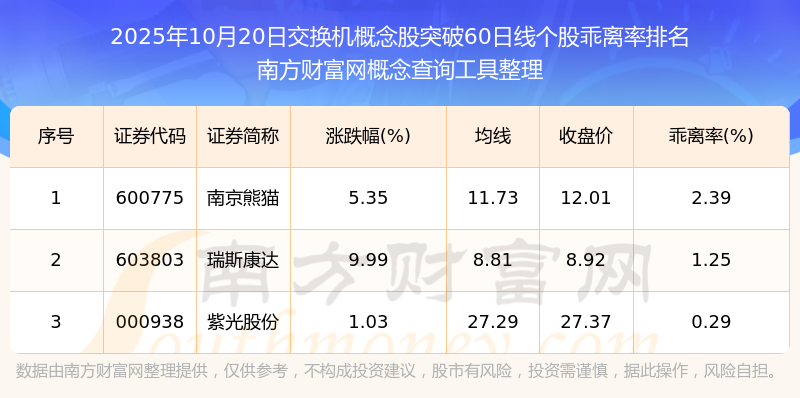 根據(jù)南方財富網(wǎng)概念查詢工具數(shù)據(jù)統(tǒng)計,截止2025年10月20日收盤,交換機概念股共有3只個股收盤價向上突破了60日線。其中乖離率較大的個股有南京熊貓、瑞斯康達、紫光股份等,乖離率分別為2.39%、1.25%、0.29%。