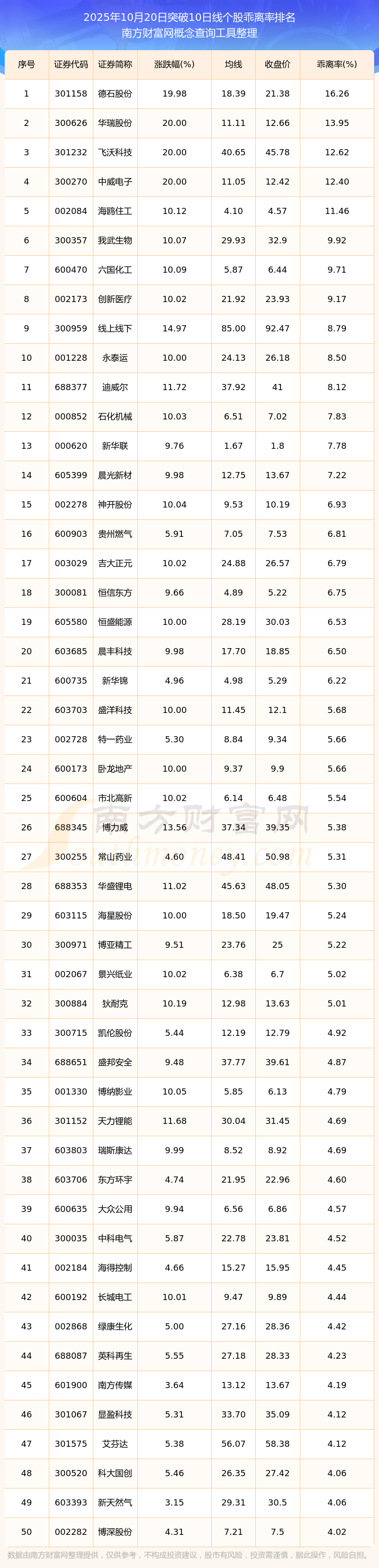 2025年10月20日突破10日線個(gè)股乖離率排名