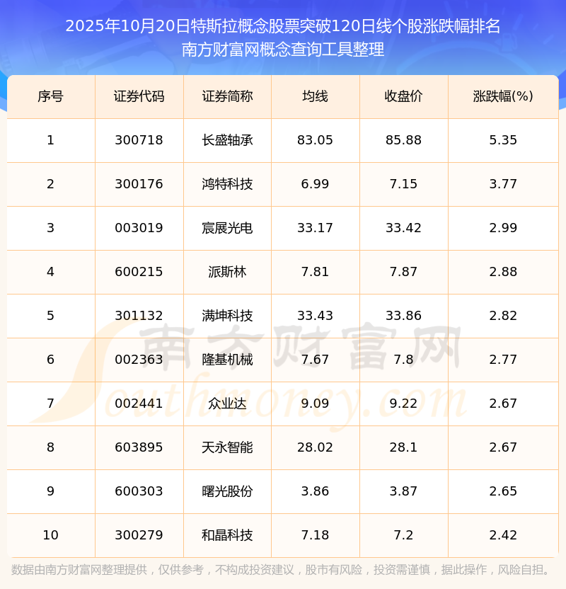 2025年10月20日特斯拉概念股票突破120日線個(gè)股漲跌幅排名