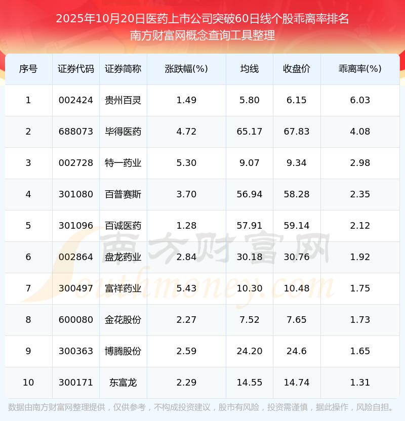 2025年10月20日醫(yī)藥上市公司突破60日線個股乖離率排名
