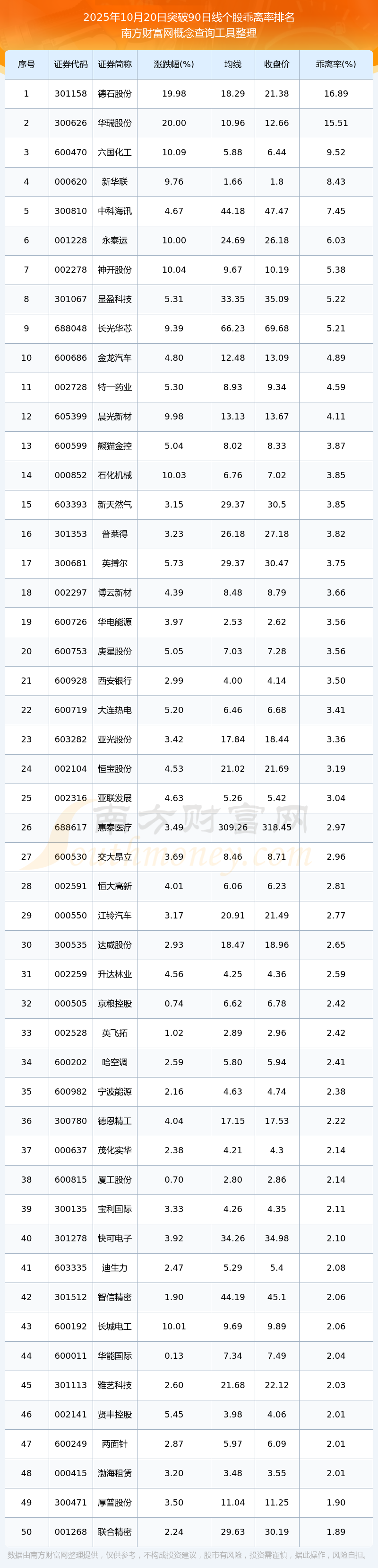 2025年10月20日突破90日線個(gè)股乖離率排名