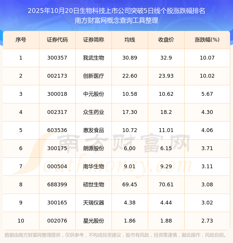 2025年10月20日生物科技上市公司突破5日線個(gè)股漲跌幅排名