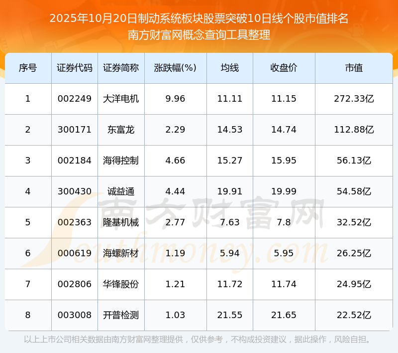 2025年10月20日制動(dòng)系統(tǒng)板塊股票突破10日線個(gè)股市值排名