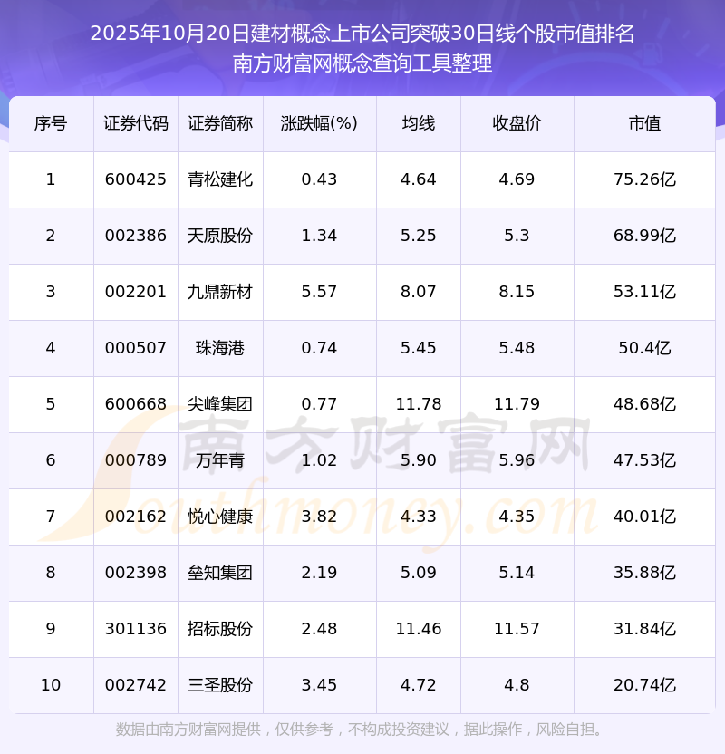 2025年10月20日建材概念上市公司突破30日線個(gè)股市值排名