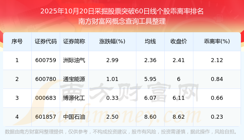 2025年10月20日采掘股票突破60日線個(gè)股乖離率排名