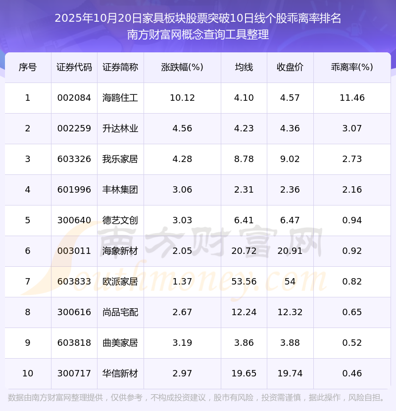 2025年10月20日家具板塊股票突破10日線個股乖離率排名