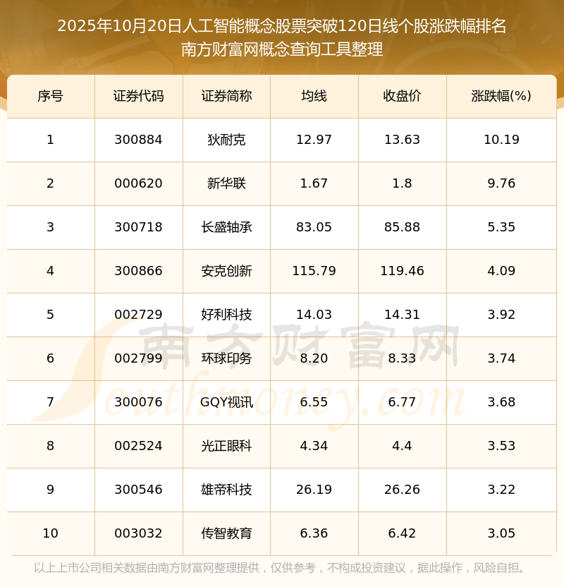 2025年10月20日人工智能概念股票突破120日線個(gè)股漲跌幅排名