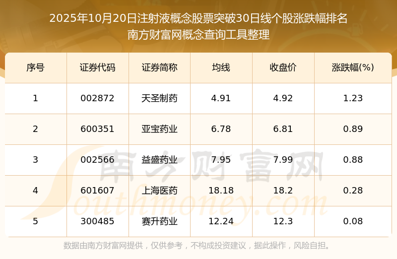 2025年10月20日注射液概念股票突破30日線個股漲跌幅排名