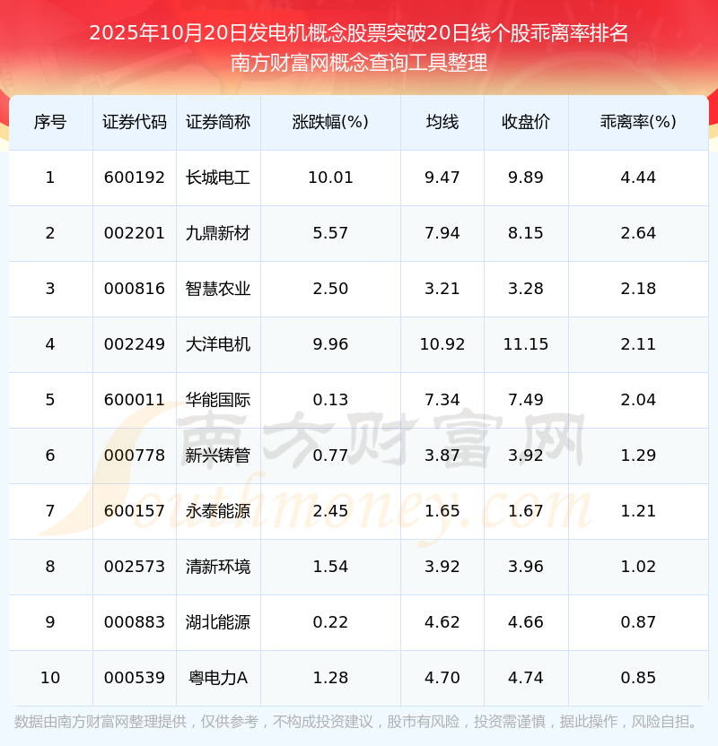 2025年10月20日發(fā)電機(jī)概念股票突破20日線(xiàn)個(gè)股乖離率排名