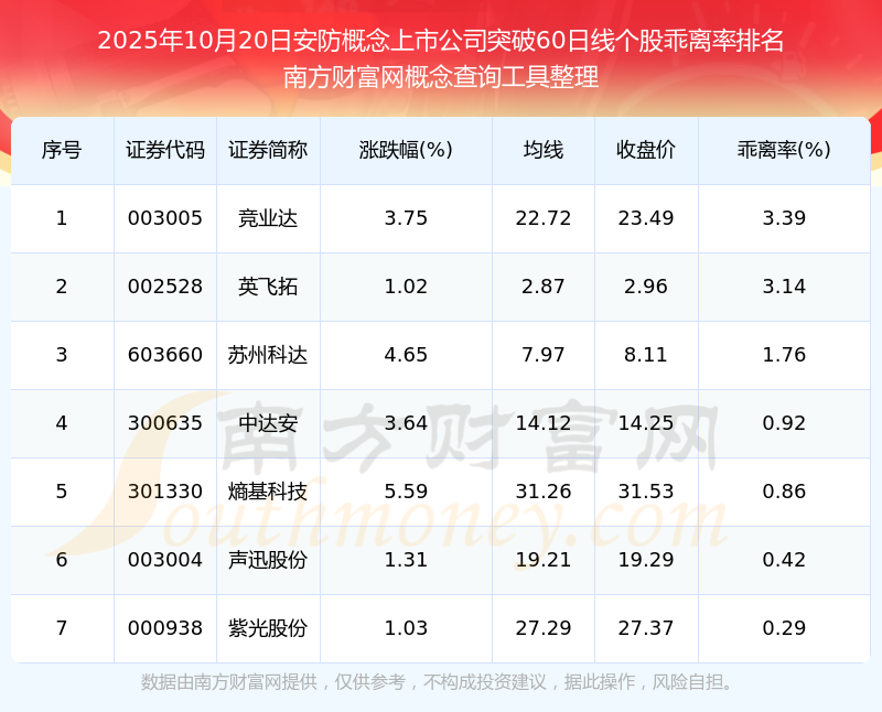 2025年10月20日安防概念上市公司突破60日線個(gè)股乖離率排名