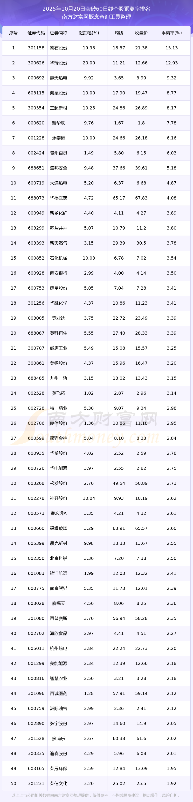 2025年10月20日突破60日線個股乖離率排名