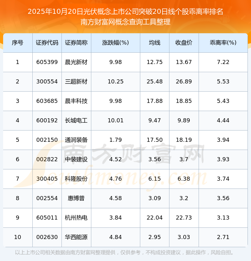 2025年10月20日光伏概念上市公司突破20日線個(gè)股乖離率排名