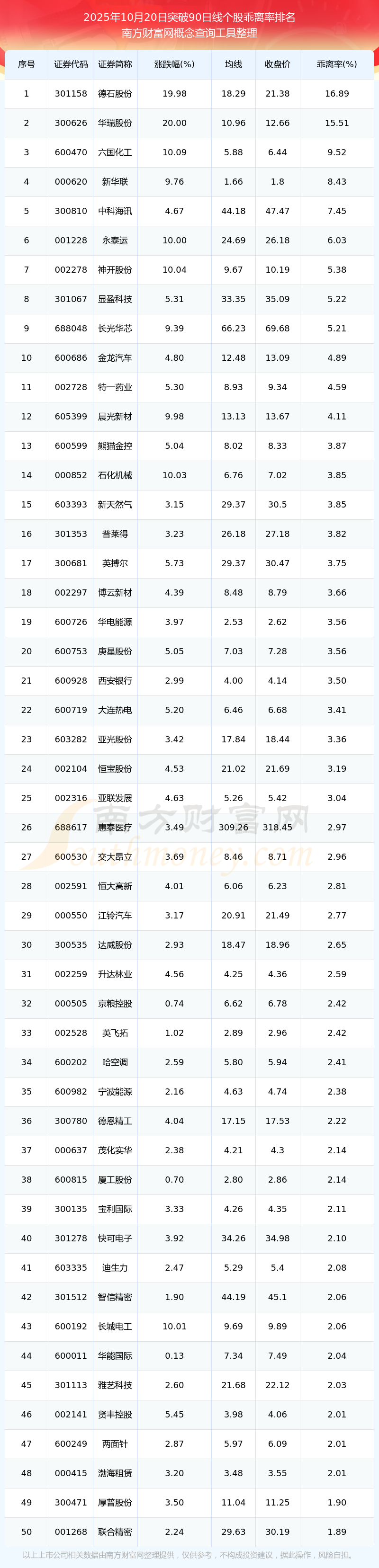根據(jù)南方財富網(wǎng)概念查詢工具數(shù)據(jù)統(tǒng)計,截止2025年10月20日收盤,共有262只個股收盤價向上突破了90日線,其中乖離率較大的個股有德石股份、華瑞股份、六國化工、新華聯(lián)、中科海訊等,乖離率分別為16.89%、15.51%、9.52%、8.43%、7.45%。