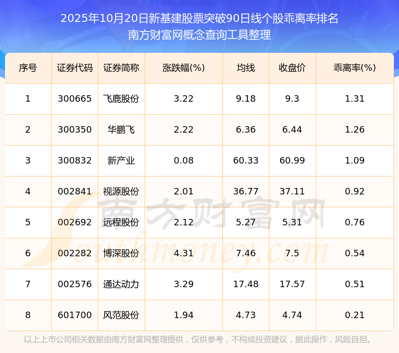 2025年10月20日新基建股票突破90日線個(gè)股乖離率排名