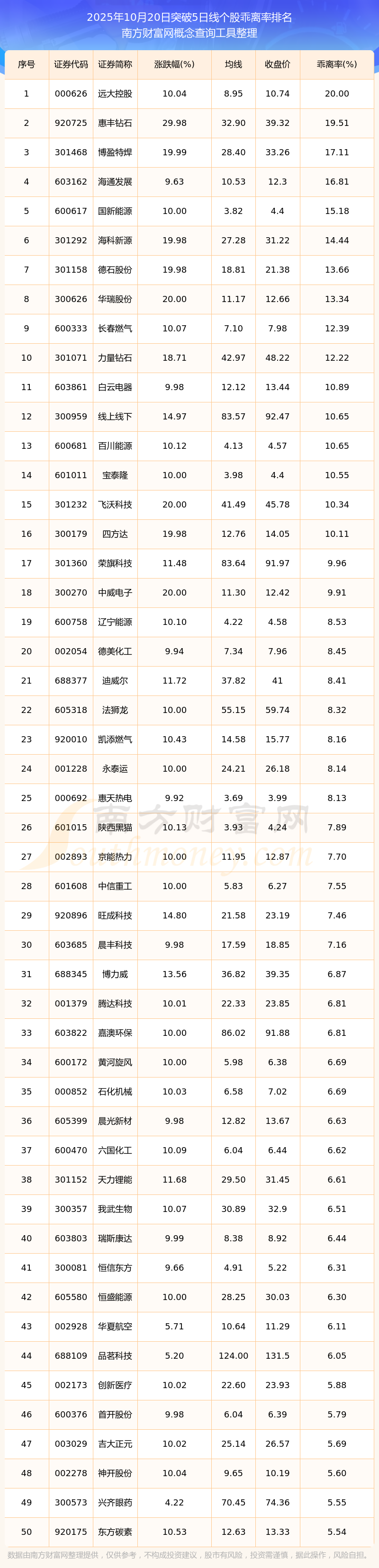 2025年10月20日突破5日線個(gè)股乖離率排名