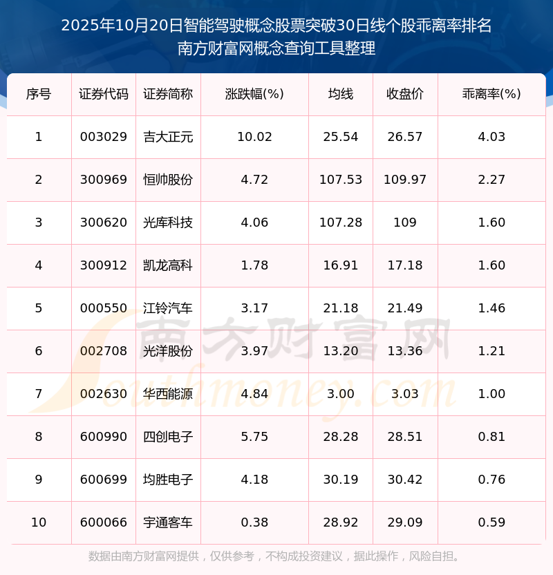 2025年10月20日智能駕駛概念股票突破30日線個(gè)股乖離率排名