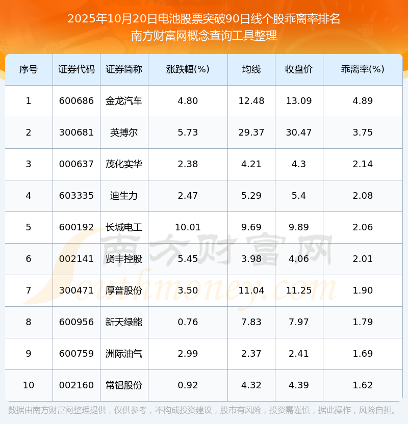 2025年10月20日電池股票突破90日線個(gè)股乖離率排名