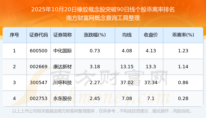 根據(jù)南方財富網(wǎng)概念查詢工具數(shù)據(jù)統(tǒng)計,截止2025年10月20日收盤,橡膠概念股共有4只個股收盤價向上突破了90日線。其中乖離率較大的個股有中化國際、康達(dá)新材、川環(huán)科技等,乖離率分別為1.23%、1.14%、0.86%。