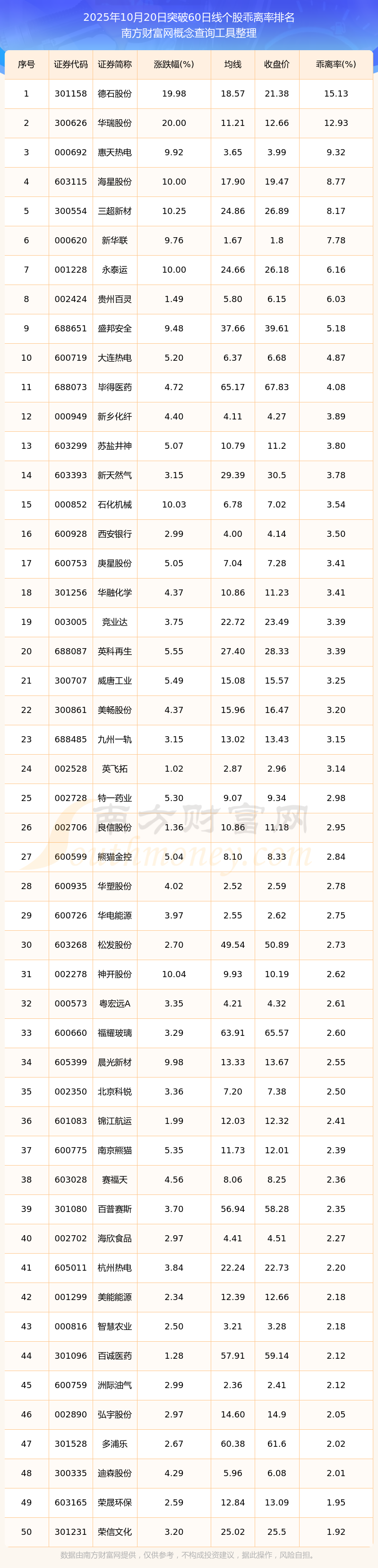 2025年10月20日突破60日線個(gè)股乖離率排名