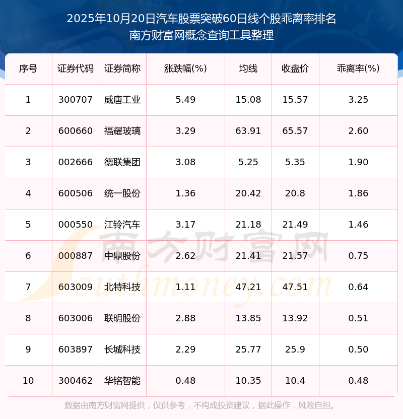 根據(jù)南方財(cái)富網(wǎng)概念查詢工具數(shù)據(jù)統(tǒng)計(jì),截止2025年10月20日收盤,汽車股票共有12只個(gè)股收盤價(jià)向上突破了60日線。其中乖離率較大的個(gè)股有威唐工業(yè)、福耀玻璃、德聯(lián)集團(tuán)等,乖離率分別為3.25%、2.60%、1.90%。