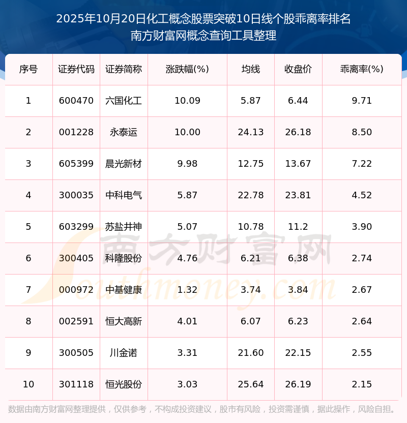 2025年10月20日化工概念股票突破10日線個(gè)股乖離率排名