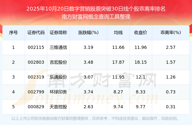 2025年10月20日數(shù)字營(yíng)銷股票突破30日線個(gè)股乖離率排名