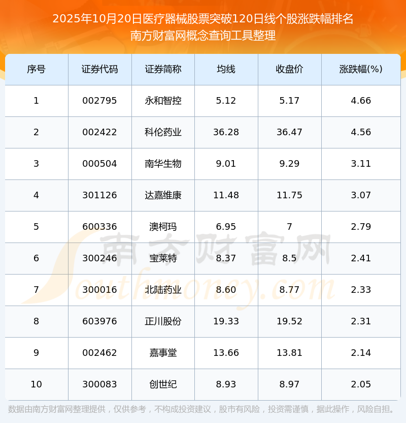 根據(jù)南方財富網(wǎng)概念查詢工具數(shù)據(jù)統(tǒng)計,截止2025年10月20日收盤,醫(yī)療器械股票共有21只個股收盤價向上突破了120日線。其中漲幅較大的個股有永和智控、科倫藥業(yè)、南華生物等,漲幅分別為4.66%、4.56%、3.11%。