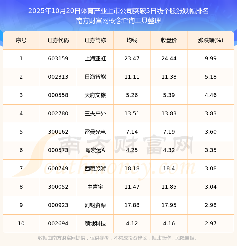 2025年10月20日體育產(chǎn)業(yè)上市公司突破5日線個股漲跌幅排名