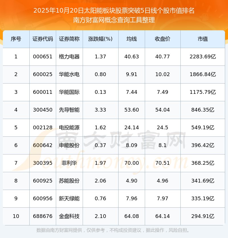 2025年10月20日太陽能板塊股票突破5日線個股市值排名