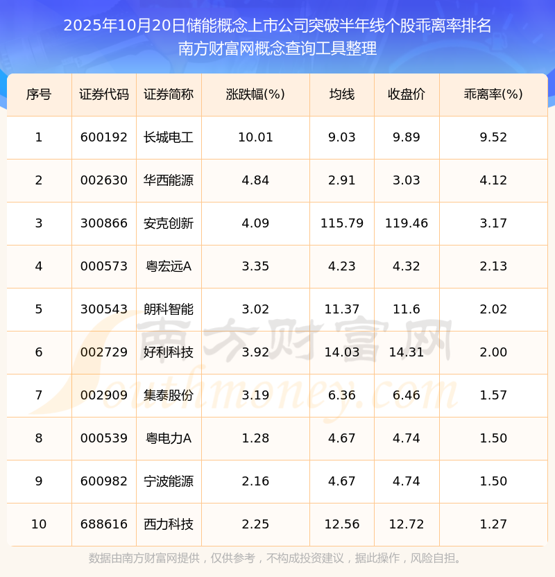 2025年10月20日儲能概念上市公司突破半年線個股乖離率排名