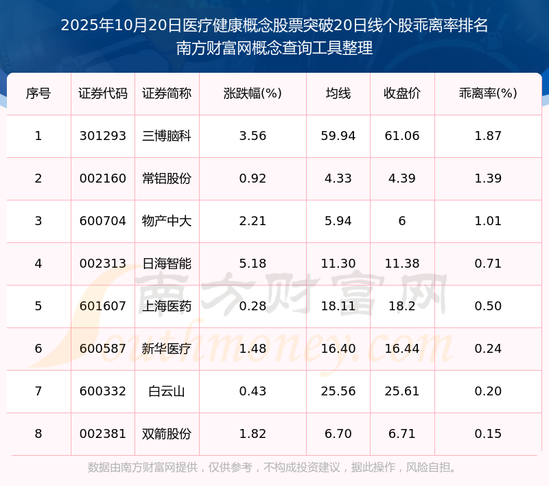 2025年10月20日醫(yī)療健康概念股票突破20日線個(gè)股乖離率排名