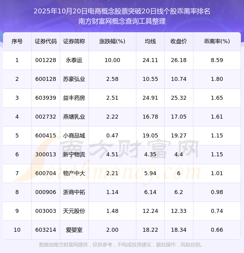 2025年10月20日電商概念股票突破20日線個(gè)股乖離率排名
