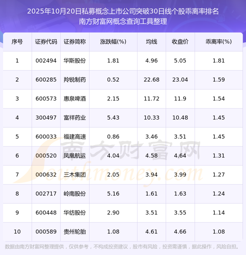 2025年10月20日私募概念上市公司突破30日線個(gè)股乖離率排名