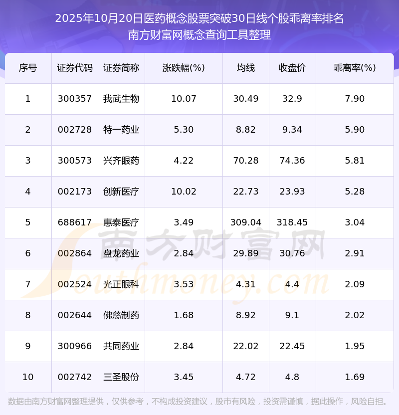 2025年10月20日醫(yī)藥概念股票突破30日線(xiàn)個(gè)股乖離率排名