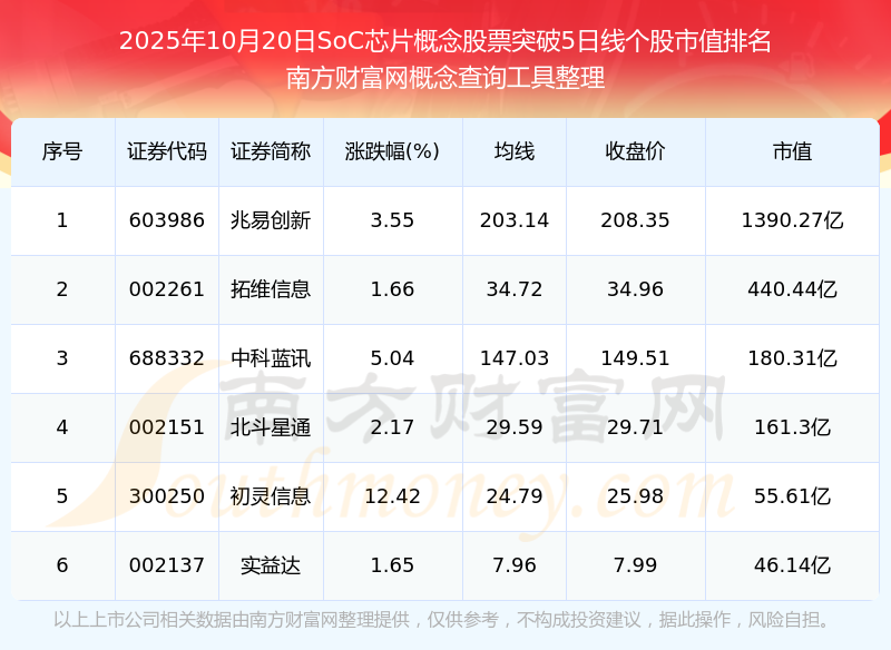 根據南方財富網概念查詢工具數據統(tǒng)計,截止2025年10月20日收盤,SoC芯片概念股票共有6只個股收盤價向上突破了5日線。其中市值較大的個股有兆易創(chuàng)新、拓維信息、中科藍訊等,市值分別為1390.27億、440.44億、180.31億。