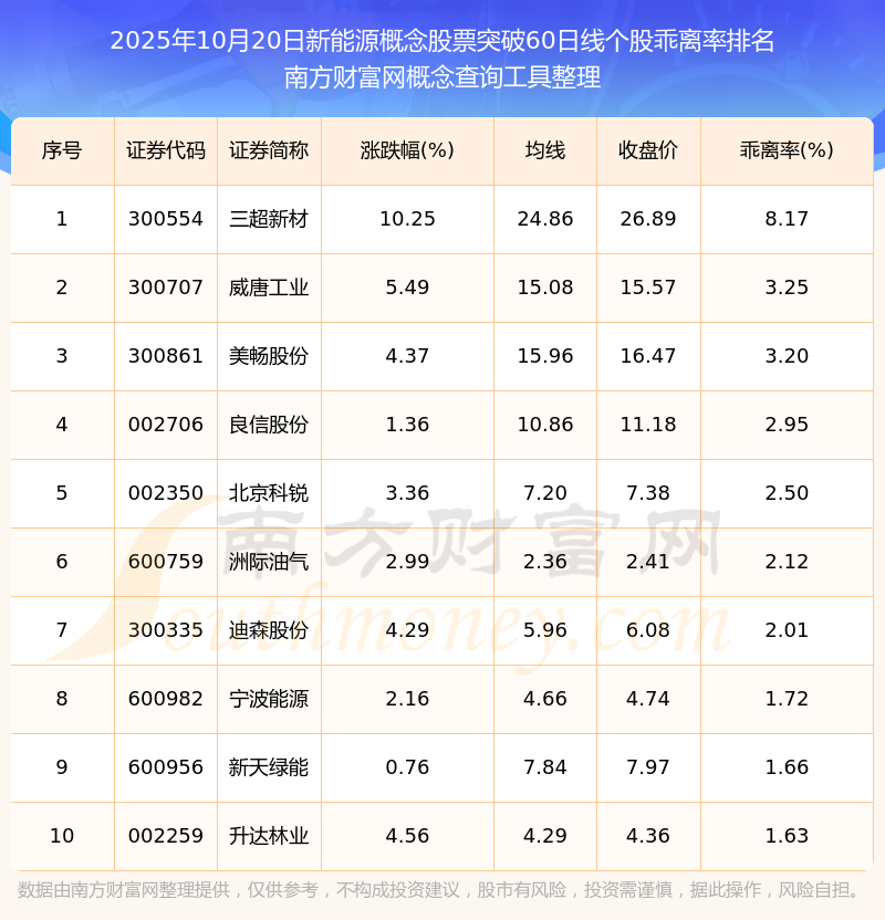 根據(jù)南方財富網(wǎng)概念查詢工具數(shù)據(jù)統(tǒng)計,截止2025年10月20日收盤,新能源概念股票共有48只個股收盤價向上突破了60日線。其中乖離率較大的個股有三超新材、威唐工業(yè)、美暢股份等,乖離率分別為8.17%、3.25%、3.20%。