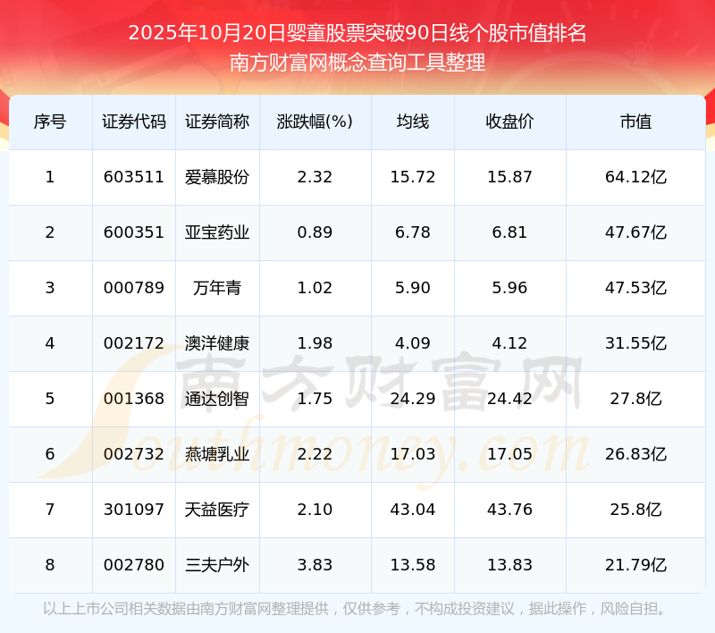 2025年10月20日嬰童股票突破90日線個(gè)股市值排名