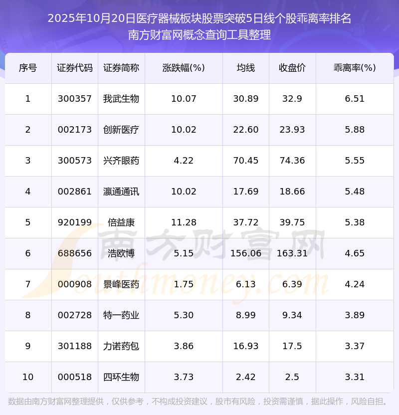 2025年10月20日醫(yī)療器械板塊股票突破5日線個(gè)股乖離率排名