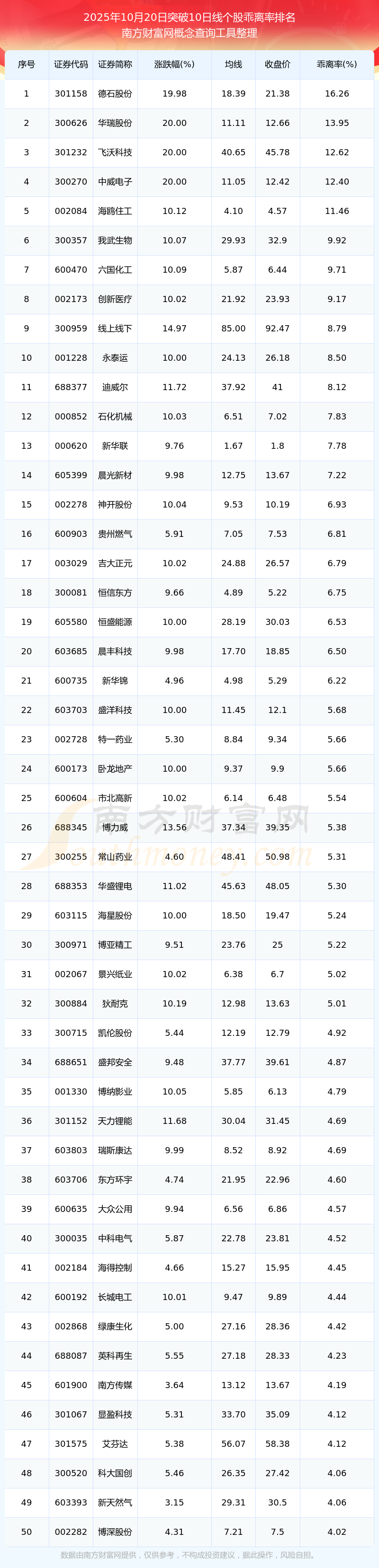 2025年10月20日突破10日線個(gè)股乖離率排名