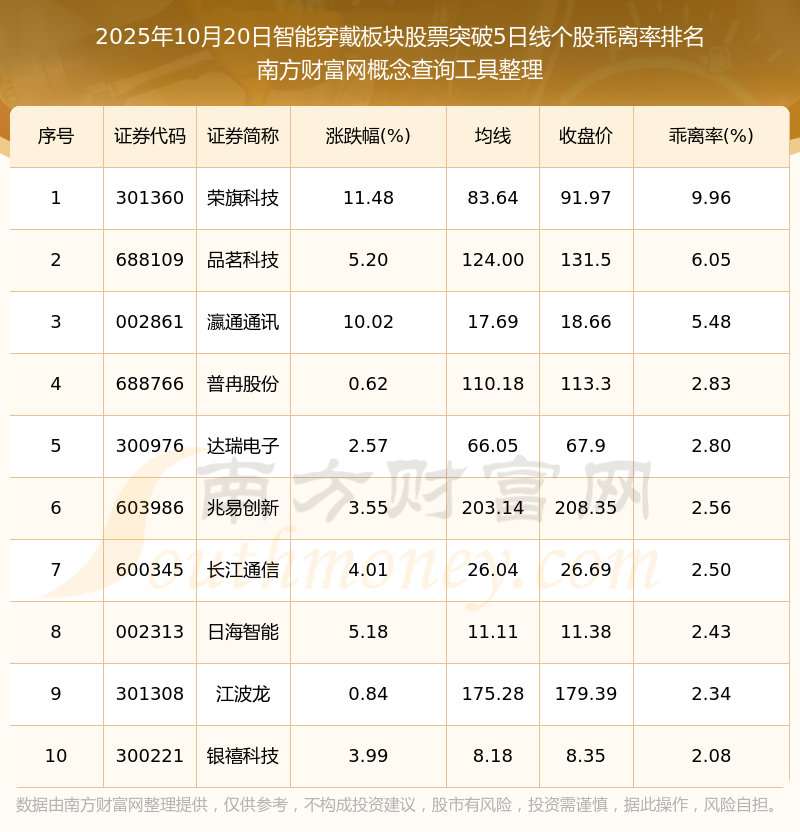 根據(jù)南方財(cái)富網(wǎng)概念查詢工具數(shù)據(jù)統(tǒng)計(jì),截止2025年10月20日收盤,智能穿戴板塊股票共有44只個(gè)股收盤價(jià)向上突破了5日線。其中乖離率較大的個(gè)股有榮旗科技、品茗科技、瀛通通訊等,乖離率分別為9.96%、6.05%、5.48%。