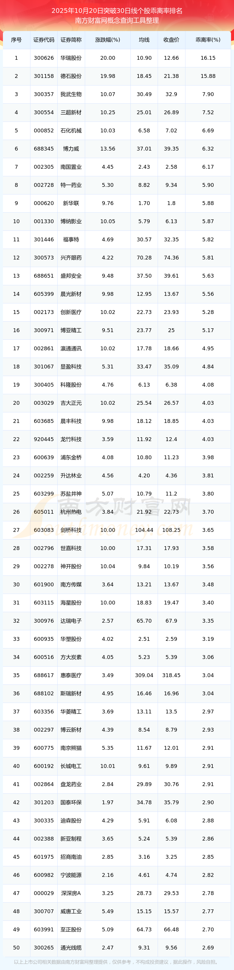 根據(jù)南方財富網(wǎng)概念查詢工具數(shù)據(jù)統(tǒng)計,截止2025年10月20日收盤,共有387只個股收盤價向上突破了30日線,其中乖離率較大的個股有華瑞股份、德石股份、我武生物、三超新材、石化機(jī)械等,乖離率分別為16.15%、15.88%、7.90%、7.52%、6.69%。