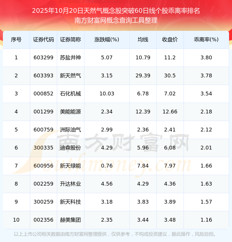 2025年10月20日天然氣概念股突破60日線(xiàn)個(gè)股乖離率排名
