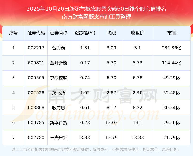 根據(jù)南方財富網(wǎng)概念查詢工具數(shù)據(jù)統(tǒng)計,截止2025年10月20日收盤,新零售概念股票共有7只個股收盤價向上突破了60日線。其中市值較大的個股有合力泰、金開新能、京糧控股等,市值分別為231.86億、114.44億、49.29億。